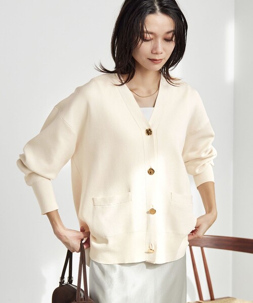 デイリーユースにぴったりなパフニットのカーデ■デザインインパクトのあるメタル調の変形ボタンがポイントのカーディガン。ベーシックなデザインながらも、さらっと羽織るだけで着映えします。サイドのスリットでさりげなく抜け感を演出しました。着回し力があり、幅広いシーンで頼りになる一枚です。■素材さらりとした肌触りが心地よいニット地。スムース編みにすることで、スウェットライクな厚みときれいめ見えする表面に仕上げました。■コーディネートボタンを全部閉めて、プルオーバー風に着るのが◎シアーロンTやロゴTとのレイヤードスタイルもおすすめです。・同素材のプルオーバーのご用意もございます。対象品番:36131000015#春服,#秋服============================光沢感:なしケア方法:手洗い可============================【注意事項】※画像の商品はサンプルです。実際の商品と色味、仕様、加工、サイズ、素材等が若干異なる場合がございます。※工場の生産の都合上、納期が変更になる場合がございます。発送日の前後についてはあらかじめご了承ください。※入荷状況により、お客様への発送が店頭販売より遅れる場合もございます。※商品を使用前に、タグ等に記載されている「取り扱い上の注意書き」、「洗濯表示」を必ずご確認ください。※商品画像は、光の当たり具合やパソコンなどの閲覧環境により、実際の色味と異なって見える場合がございます。あらかじめご了承ください。※商品の色味の目安は、商品単体の画像をご参照ください。店舗へお問い合わせの際は、全国のgreen label relaxing各店舗まで下記の品名/品番をお申し付けください。品名:FFC HW puffknit CD 品番:36281000004