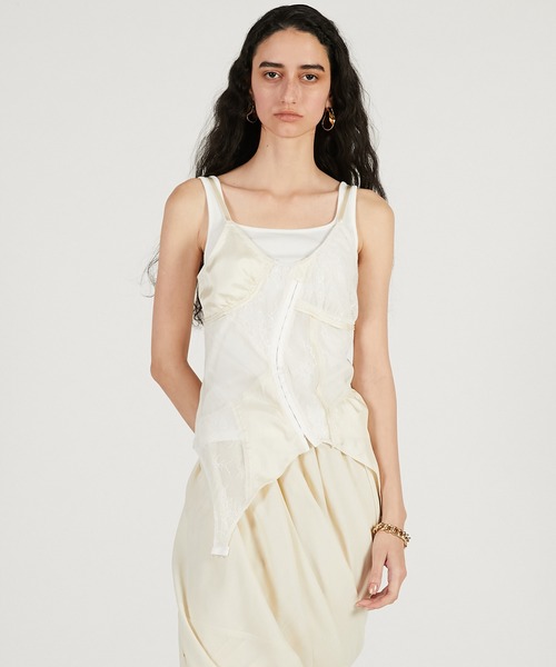 ー Style ー ランジェリーを解体して接ぎ合わせたようなデザインのキャミソール。 アシンメトリックな切り替えと歪んだフックアイテープがキャッチーな一着。 インナーのタンクはセットになっており、1枚で着用可能。 ジャケットのインやマニッシュなボトムと相性抜群◎ー Fabric ー 繊細なランジェリーライクなレースとチュール、微光沢サテンの3種類の素材をMIXした一着。 インナーの生地は伸縮性に富んだテレコ素材を使用。 【PRANK PROJECT/プランクプロジェクト】 常識に縛られない洗練された大人の女性に向けて ”意外性” と ”品の良さ” をMIXさせた 上質なNEW MODE BRAND ・商品のお気に入り登録再入荷、残り1点などの通知を受け取ることが出来ます。 ・ブランドのお気に入り登録新商品や再入荷、ショップのおすすめトピックスなど、いち早くブランドのお得な情報を受け取ることができます。