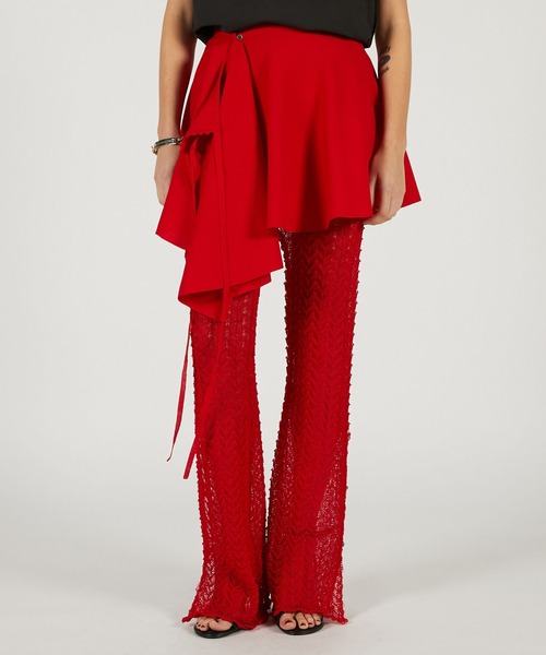 ー Style ーニットで仕立てたフレアーラップスカートと同素材のニットパンツをレイヤードしたコンビデザイン。柔らかさの中に構築的なシルエットを描く、モードなバランスのセットアイテム。それぞれ単品使いもおすすめでスタイリングの幅を広げてくれる。ー Fabric ー繊細なハイゲージで編み立てられたすかし編みニット。サラリとした清涼感のある手触り。スカート:ポリエステル糸をプレーティングし、フォルム感が出るシルエットに編み立てている。パンツ:トゲのような凹凸のある透かし編みでスカートとのコントラストがポイント。裏地付き。【PRANK PROJECT/プランクプロジェクト】常識に縛られない洗練された大人の女性に向けて”意外性” と ”品の良さ” をMIXさせた上質なNEW MODE BRAND・商品のお気に入り登録再入荷、残り1点などの通知を受け取ることが出来ます。・ブランドのお気に入り登録新商品や再入荷、ショップのおすすめトピックスなど、いち早くブランドのお得な情報を受け取ることができます。