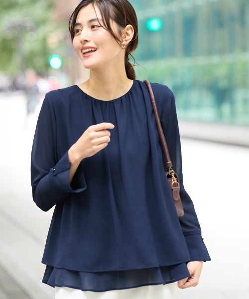 裾の2段ティアードが軽やかに揺れる、華やかで上品なブラウス♪シフォン×カットソー素材で透けにくく快適。通勤やセレモニーなど、きちんとシーンにぴったりの一枚です。●Detail/特徴裾の2段デザインのティアードがしなやかに動く、華やかなブラウスです♪フレアー袖口のカフスが上品さをプラスし、一枚でも華やかに着こなせます!ジャケットとレイヤードすると、裾からのぞくフレアーが華やかなスタイルが完成します。きれいめな印象で、通勤などのビジネスシーンから、卒入学や学校業など、きちんと装いたいときに幅広く活躍します。●おすすめシーンセットアップできちんとしたシーンにも、単品使いでデイリースタイルにも!入園式、卒園式、入学式、卒業式、参観日、保護者会、七五三、お宮参り、謝恩会、二次会、オフィス、通勤、リモート会議●Fabric/素材外側はサラッとして柔らかめのあるシフォン素材です。身頃の内側は、薄手で肌ざわりのよいカットソーを使用して透けにくい仕様に仕上げました。洗濯:手押し洗い ---------------------------------------------------------------------【お買物をよりお楽しみいただく為に】▼商品のお気に入り登録をおすすめします♪『♥をクリック!』完売カラーの再入荷やラスト1点の追加、セールの際の通知を受ける事ができます。ブランドのお気に入り登録もご一緒にお願い致します。---------------------------------------------------------------------