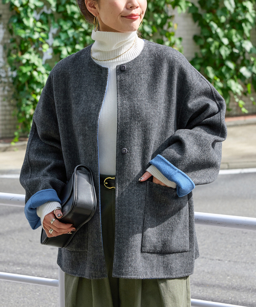 高級感あるSuper120の糸をブレンドしたリバーシブルコート。※こちらは《品番:25020700801030》の追加商品です。・同一商品でも個体差が生じるため、採寸内容に若干の差が生じる場合がございます。肌触りが滑らかで光沢感としなやかな特徴がある、繊維の細いSuper120をブレンドした上品なアイテム。キレイな配色の目の惹く色を選び、リバーシブル着用もイメージがガラリと変わるような楽しさのあるコートになっています。クルーネックのすっきりとしたネックラインなのでハイネックやタートルのニットを着ても顔周りがもたつかず、ストールなどを巻いたアレンジもしやすくなっています。ドライクリーニングにてお手入れ可能です。※表と裏のカラー配色についてグレー(006)⇒ 表:グレー×裏:ブルーブラウン(020) ⇒ 表:ブラウン×裏:レッドネイビー(040)⇒ 表:ネイビー×裏:イエロー(リバーシブル仕様です)●シリーズ商品・ブラック/グレー/ブラウン/ピンク展開品番:25020700800030 S120ブレンドリバーシブルコート・ブラック/グレー/ブラウン+新色グレーA/ブラウンA/ネイビー展開(こちらの新色は、リバーシブルシリーズのショート丈タイプと同色になります。)品番:25020700800130 《追加》S120ブレンドリバーシブルコート・グレー/ブラウン/ネイビー展開品番:25020700801030 S120ブレンドショート丈リバーシブルコート品番:25020700801130 《追加》S120ブレンドショート丈リバーシブルコート**********************透け感:なし裏地:なし(リバーシブル仕様)伸縮性:なし光沢感:なし生地の厚さ:普通**********************【スタッフ着用コメント】《スタッフ staff.Y》身長:160cm/普段サイズ:M-L/着用サイズ:フリーサイズ感:程よいゆとり感でインナーも選ばなそうです。素材感:程よい起毛感で柔らかいです。着心地:腕周りも適度な余裕があるので動きやすいです。※あくまで個人の感想です。**********************※取り扱いについては、商品についている品質表示でご確認ください。・直射日光を避け、日陰干しにしてください。※こちらの商品は、B.C STOCKでの取り扱いになります。 直接店舗へお問い合わせの際はB.C STOCK店舗へお願い致します。※照明の関係により、実際よりも色味が違って見える場合があります。またパソコン・スマートフォンなどの環境により、若干製品と画像のカラーが異なる場合もございます。※商品の色味は、商品アップ画像をご参照ください。グレー着用スタッフ:157cm 着用サイズ:フリーブラウン、ネイビー着用スタッフ:163cm 着用サイズ:フリー詳細着用モデル:163cm 着用サイズ:フリー本体:ドライクリーニング