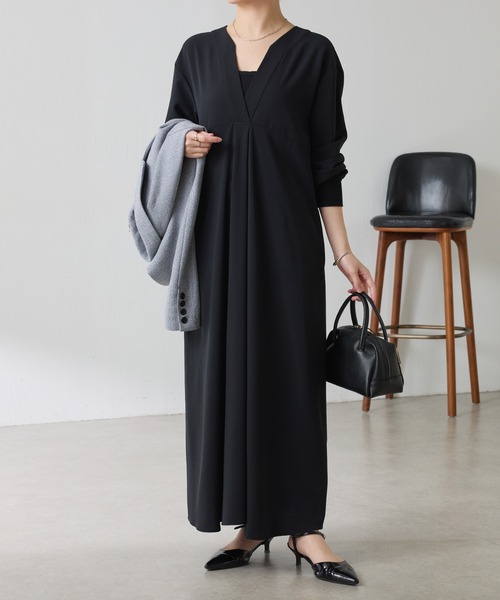 大人気のジャージシリーズから1枚でサマになるワンピースが登場!【POINT】・首元のスキッパーデザインが顔周りをすっきり見せてくれるワンピース。・フロントはドレープになるようタックを入れ、シンプルながらも1枚で着映えします。・シワになりにくい微伸縮の素材がデイリー使いしやすく、ストレスフリーな着心地に◎・袖口はリブ仕様で、捲ったときにもしっかりと固定されます。【おすすめコーディネート】同じシリーズの【ジャージノーカラーダブルジャケット CLZ1061207A0002】と合わせてセレモニーやきちんとシーンにもぴったりです。Vネックなので【C′NOTE/ノート シアー切り替えスクエアタンクトップ CLZ5041506A0001】と合わせてシアー部分を覗かせるのもおすすめです。【おすすめのスタイリングアイテム】・ツイードオーバージャケット CLZ1061107A0001【大人気のジャージ素材シリーズ】・ジャージスキッパードルマンシャツ CLZ1061304A0001・ジャージVネックワンピース CLZ1061209A0001・ジャージノーカラージャケット CLZ1061207A0002・ジャージスリムテーパードパンツ CLZ1061202A0001・ジャージワイドパンツ CLZ1061202A0002・ジャージマーメイドスカート CLZ1061201A0001・ジャージーサロペット CLZ1051209A0002【素材】《ライトブルー》表地:ポリエステル100%リブ:レーヨン92%, ポリウレタン8% 《ブラック》表地:ポリエステル100%リブ:レーヨン95%, ポリウレタン5%透け感:なし裏地:あり伸縮性:あり光沢感:なしおすすめ着用時期:秋、春、夏洗濯:手洗い可≪返品・交換について≫・着用後、洗濯後の返品・交換は致しかねます。・商品到着後、着用前に商品状態のご確認をお願い致します。・ECサイトでご購入いただいた商品は、お修理を承っておりません。【気になる商品は「お気に入り」登録を】ハートマークをクリックし、お好きなカラーを選んでお気に入りに登録すると入荷情報や残り1点の通知、完売カラーの再入荷、セール情報などを受け取ることができます。※撮影場所やお使いのモニター環境により若干お色味が異なる場合がございます。特にロケの撮影では明るく見える傾向にございます。詳細撮影画像で色味をお確かめくださいます様お願いいたします。※サンプルで撮影をしております。若干の仕様が変更になる場合がございますので予めご了承の上ご注文くださいますようお願いいたします。※サンプルでの採寸のためあくまで目安となります。予めご了承ください。
