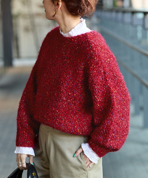 今年も登場!新色尽くしのカラーバリエーション豊富に揃えています。※こちらは《品番:24080700820030、24080700820130、24080700820230、24080700820330、24080700820430、25080700823030、25080700823130、25080700823230、25080700823330》の追加商品です。・グレー(006)カラー以外は新色となります。・同一商品でも個体差が生じるため、採寸内容に若干の差が生じる場合がございます。タイプの異なる4種類の糸を引き揃えてミックス調にした前後2wayのニット。ポコポコとした見え感にフェザーのフワフワ感とゆるっとした雰囲気が可愛いく、カラフルでキャッチーな一枚着映えのタイプです。秋口からTシャツに羽織としてお使いいただける素材でチクチク感が気にならず、表面感が新しい他にはないB.C STOCKならではのアイテムになっています。手洗い可能でご自宅でのイージーケアができるのも嬉しいポイントです!**********************透け感:なし裏地:なし伸縮性:あり光沢感:なし生地の厚さ:普通~やや厚手**********************【スタッフ着用コメント】《スタッフ staff.K》身長:162cm/普段サイズ:S-M/着用サイズ:フリーサイズ感:中に着込めるゆとりがあります。素材感:柔らかくチクチクは感じないニット生地。着心地:やや重みあり。編地が緩めなのでふわっとした肌触りのニット生地で着やすいです。素材がミックス調なのもあって、やや毛抜けしやすいニットです。※あくまで個人の感想です。**********************※旧品番と素材が一部異なりますが、風合いに大きな違いはございません。※取り扱いについては、商品についている品質表示でご確認ください。・単独で洗ってください。・自重により伸びや型崩れすることがあります。形を整えて平干しにしてください。※こちらの商品は、B.C STOCKでの取り扱いになります。 直接店舗へお問い合わせの際はB.C STOCK店舗へお願い致します。※照明の関係により、実際よりも色味が違って見える場合があります。またパソコン・スマートフォンなどの環境により、若干製品と画像のカラーが異なる場合もございます。※商品の色味は、商品アップ画像をご参照ください。グレー、ナチュラル、パープル B着用スタッフ:163cm 着用サイズ:フリーブラウン、レッド着用スタッフ:157cm 着用サイズ:フリー詳細着用モデル:162cm 着用サイズ:フリー本体:手洗い可能