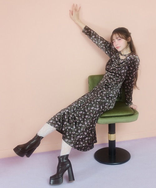 柔らかな落ち感が美しい、レディに仕上がるベロアワンピ華やかなフラワー柄をのせたベロア素材が、冬の装いに上品な艶を添えるロングワンピース。胸元に寄せたシャーリングディテールと、デコルテを美しく見せるクロスリボンデザインがポイントで、1枚で着映えるフェミニンなシルエットに仕上げています。長袖で寒い季節にも着やすく、柔らかなベロアの落ち感が動くたび女性らしい印象に。ショート丈のカーディガンやファーアウターを羽織れば、クラシカルで季節感のあるスタイリングが完成します。透け感:なし裏地:あり伸縮性:あり生地の厚さ:やや薄手F:着丈118cm 身幅43.5cm 肩幅33cm 袖丈62cm ウエスト70cm