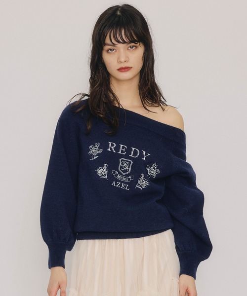 肩魅せも叶う2WAY仕様、気分で変える“美人見えニット” 繊細なフラワー刺繍とビジューを胸元にあしらった、上品見えニットプルオーバー。ブランドロゴとクラシックなエンブレムモチーフを組み合わせ、REDYAZELらしいレトロムード漂う一枚に仕上げました。広めのネックラインは“オフショルとしても着られる”デザインで、気分に合わせて着こなしアレンジが可能。ふんわり柔らかなタッチと、ゆるっとしたボリュームスリーブが女性らしい抜け感を演出します。 透け感:[ホワイト]ややあり [他]なし 裏地:なし 伸縮性:あり 生地の厚さ:やや厚手 F:着丈58cm 身幅48cm 袖丈55.5cm