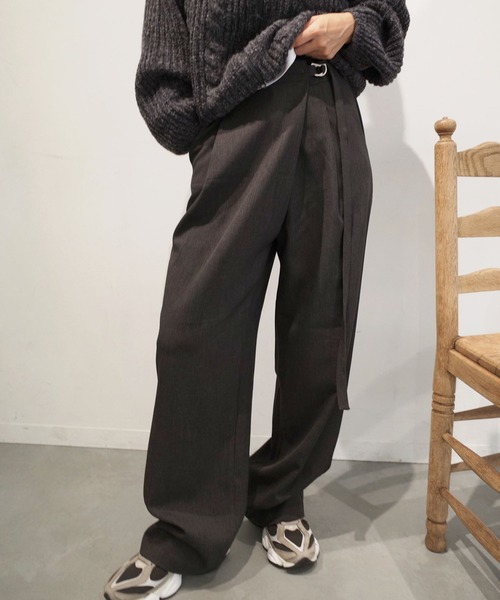 ● designフロントにラップ風デザインを取り入れたワイドシルエットパンツ。ウエスト部分のDカンベルトがアクセントとなり、モードな雰囲気をプラス。シンプルながらもディテールにこだわったデザインで、上品さとトレンド感を兼ね備えています。● fabricさらりとしたタッチと落ち感のある生地を使用。動きに合わせて揺れる質感が特徴で、シーズンレスで快適に着用できます。シワになりにくく、デイリー使いにも最適です!● stylingシャツやブラウスをインすればきれいめなオフィススタイルに、カットソーやスウェットと合わせれば抜け感のあるカジュアルスタイルに。シンプルだからこそ幅広いコーディネートに活躍する一本です。――――――――――――厚み:普通伸縮性:なし裏地:なし透け感:なし――――――――――――▼▼ぜひ、お気に入りのご登録をお願いします▼▼♡をクリックして下さい。お気に入り登録をしていただきますと、再入荷通知や、ラスト1点の通知、セールの際の通知も受け取ることができます。【ブランド】Reurie'/レウリィ/レウリー穏やかな心で日常を過ごす…毎日がちょっと幸せになるように...“Reurie‘を着ることで、何でもない日がちょっと幸せで、心も休まって、穏やかに過ごせますように。”という願いを込めて。普段のアイテムに取り入れやすい、大人カジュアルをご提案。柔らかく、リラックス感があるけど、どこか1つ芯の通ったトレンドアイテムをお届けします。【ATTENTION】※アイロンの際はあて布の使用をおすすめいたします。※商品画像につきましては、なるべく実物に近づけて撮影いたしておりますが、閲覧頂いておりますモニターによって、画像と実際の商品のお色に多少の差異が生じる場合が御座います。予めご了承下さい。※実際の色味は商品画像のトルソー着用の物撮り画像をご参照ください。より実物の色味に近く撮影したものになります。※サイズにつきましては、すべて平台に平置きにし測定しております。商品によっては実際の製品上がりサイズと1~3㎝程、多少誤差が生じる場合がございます。 予めご了承ください。