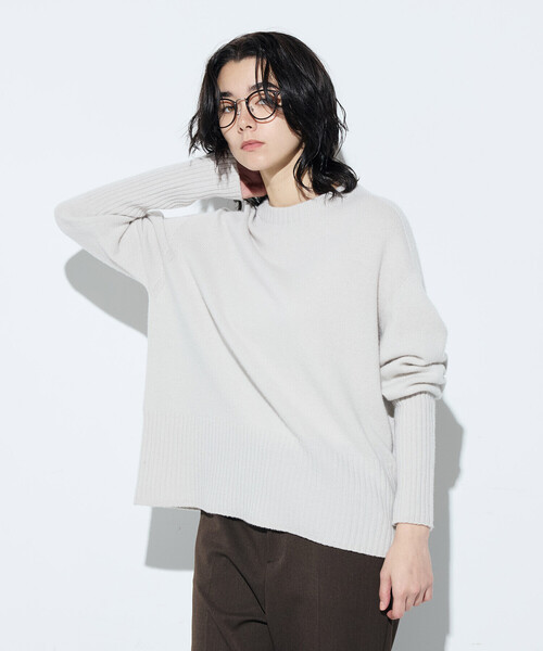 《デザイン》軽量感に優れたバルキッシュウールの特長を最大限に活かし、ゆったりサイズのプルオーバーです。身頃と袖が編み続きになり、縫い目のないホールガーメントの製法で編み立てているので、ごわつき感なく快適な着心地で、長めの袖がこの時期の冷えを防いでくれる嬉しいポイントです。長めの袖口リブを手首で止め、リブよりも上の袖を少しくしゅっとさせて着ると手首周りを華奢に見せてくれます。編地はふんわりとした天竺と太めのリブにしているので表面感にメリハリをつけて、シンプルながらコーディネートの主役になる1枚です。ストライプシャツ(商品番号:15-72HM12-205)と重ねて、冬のレイヤードコートをお楽しみください。《素材》希少な地域で飼育されるファインメリノウールの中でも、カシミヤの繊維の太さに四敵するほど超極細のウールを選りすぐった紡毛素材です。羊毛原料の特長である縮れ毛の量が非常に多いため、とてもソフトな触り心地とふっくらとした風合いになり、紡毛最大限の特長である軽さを一段と感じられます。お手入れ方法:手洗いOK