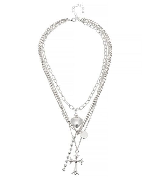 3種類の様々なチェーンがセットの3連ネックレスです。クロスチャームや、コインなどチャームも沢山ついているので首元を華やかに見せてくれます。