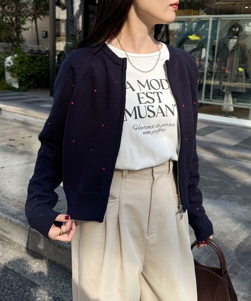 "◇fredy emue◇ 【2026 SS】 大人可愛い着こなしが叶うハンド刺繍ハートZIPカーディガン ●point ・ミニサイズのハート刺繍がさりげなくも目を惹くジップカーディガン ・程よく厚みのあるニット素材で軽やかな着心地ながら、しっかり暖かさもキープします ・前開きのZIPデザインで、羽織りとしてもトップスとしても幅広く活躍 ・コンパクトな丈感で、ボトムスやスカートともバランスよく合わせやすいのもポイント ・袖口や裾のリブ仕様がシルエットにほどよいメリハリをプラス ・甘さのあるデザインながら、大人も取り入れやすい絶妙なバランスで、デイリーコーデに華やぎを添えてくれます 透け感:なし 裏地:なし 伸縮性:あり 光沢感:なし 洗濯:手洗い可 ◇商品のお気に入り登録◇ 気になる商品は、お気に入り登録がオススメです! クーポン情報、入荷情報が、通知されるようになります。 ※お手入れの際は、商品についている品質表示タグの取扱い表示をご確認ください。 ●お取扱い上のご注意● *商品を長くご愛用していただきたいため、アテンションタグがある場合は必ずご確認の上、着用又はお取り扱い下さい。 *画像の商品はサンプルとなりますので実際の商品と仕様(主にファスナー・釦等の付属品)、加工、サイズが若干異なる場合がございます。 *店頭及び屋外での撮影画像は、光の当たり具合で色味が違って見える場合があります。商品の色味は、スタジオ撮影の画像をご参照下さい。 *商品画像に関しては出来る限り忠実に表示出来るよう努めておりますが、お客様がご利用のモニターの設定及び特性により、実際の商品と比較し色味に若干の誤差が生じる場合があります。 *製品洗い加工の商品は、多少の歪み、シワなどが見られたり、風合いやサイズ等が1枚1枚異なります。汗や雨等で濡れた時や、摩擦により色落ちし、他の衣料を汚すことがありますので(特に濃色のもの)ご注意ください。 ※サンプルでの採寸のため、サイズ表はあくまで目安となります。予めご了承ください。"