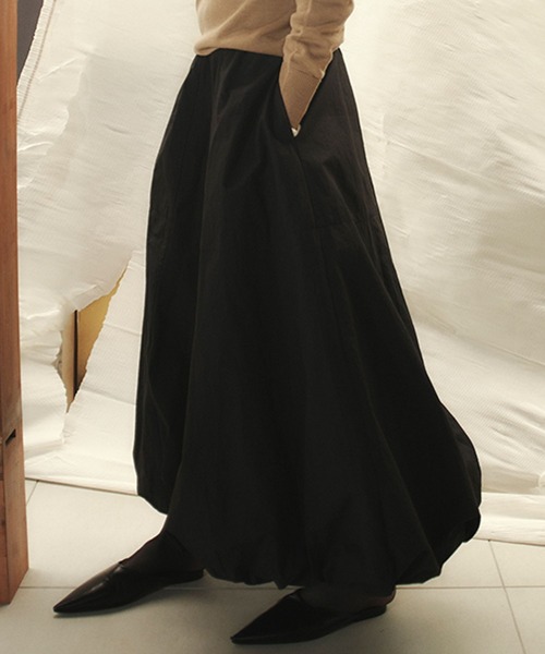 スタイリングにトレンド感をプラス程よいボリューム感が特徴的な大人のバルーンスカートーーー【素材】ハリ感とコシのあるコットンベースの素材を使用。ロングシーズン着用しやすいアイテムです。【デザイン】トレンドライクなスタイルにぴったりなバルーンスカート。適度なボリューム感がポイントになったデザインです。すっきりとした腰周りやカジュアルすぎない素材感で上品さを演出する一着になっています。ーーー【スタイリング】裾にかけてボリュームがあるので、トップスはコンパクトにメリハリのあるスタイリングがおすすめです。
