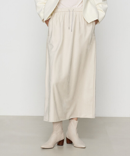 《デザイン》なめらかなスエード調の生地をいかしたスカートです。裾が少し広がるセミタイト型でたて長シルエットです。生地のストレッチ性とウエストのゴム仕様が着心地の良さのポイントです。裏地付きで肌着のラインも響かずきれいに着られます。ウエストにはワンポイントになるスピンドルを通し、紐先にきらりと光る金属パーツを付け、高級感をだしています。両サイドには縫い目利用のポケット付きです。《素材》見た目から秋を感じるスエードがジャージ素材で登場です。ヴェルヴェットのような手触りとストレッチ性がありながらも、環境に負担をかけないように、リサイクルポリエステルを使用しています。