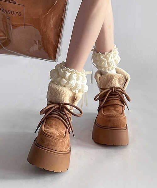 -おすすめポイント♪- 5cmの厚底でスタイルアップしながら、ころんとしたシルエットがかわいいボアムートンブーツです♡足首のボア折り返しがふわっと見えて、冬らしいアクセントに太めのシューレースが今っぽいトレンド感をしっかりプラスします! 内側は起毛であたたかい履き心地外側はしっかりしたフェイクムートン素材で、冬のお出かけにもぴったりです◎ ミニ丈ボトムと合わせてブーツを主役にしたスタイルが可愛い♡ワイドパンツやスウェットコーデに合わせて、カジュアルにまとめるのもおすすめ!ベージュとブラウンの2色展開で、どちらも毎日のコーデに合わせやすい万能アイテムです -お買い物をお楽しみいただくために- ◆Instagram◆ lacvert_official 新作情報やルックを配信中 ◆この商品が気になったらお気に入り登録 完売カラーの再入荷通知やセール情報、ラス1情報などの通知を受け取ることができます♪ ◆LAC VERTをお気に入りブランドに登録 新商品や入荷情報を受け取ることができるので、いち早く新作をチェックできます!是非ご登録してくださいね♪ ※撮影時のライティング、ご覧になっているモニター・PC環境により、実際の商品と色味が異なって見える場合がございます。予めご了承をお願い致します。 韓国 韓国ファッション 韓国風 シンプル 大人 韓国通販 かわいい 可愛い おしゃれ オシャレ プチプラ トレンド ストリート 量産型 通勤 通学 ペアルック プチプラ 大人かわいい 冬服 防寒 ムートン ファー 厚底 冬 秋 ブーツ ※他のキャンペーンにより、期間中に価格が変動する場合があります。※セールは予告なく終了させていただく場合もあります。