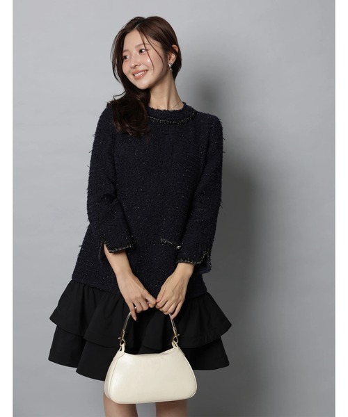 ツイード調の表面感と配色トリミングがクラシックなムードを引き立てるワンピース。ゆるやかなAラインにフリル切り替えを重ね、華やかさと可愛らしさを両立します。ブーツで大人カジュアルに、パンプス合わせで上品な印象にも仕上がる一枚。一着で存在感があり、お出かけシーンでも主役として活躍します。【ご注意】※撮影照明の関係により、実際の商品と色味が異なって見える場合がございます。また、パソコン・スマートフォンなどの環境により、製品と画像のカラーが異なる場合もございます。予めご了承ください。※商品画像はサンプルのため、色味やサイズ等の仕様に変更がある場合がございますので、予めご了承ください。