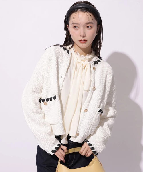 ほどよい存在感を放つブークレ素材で仕立てた、コーデの主役になるニットジャケット。 縁に施された配色ディテールが上品なアクセントになり、羽織るだけでクラシックなムードを演出します。 デニムやスカート、ワンピースまで幅広く合わせやすく、きれいめにもカジュアルにも着回せる万能アウター。 軽やかな着心地で、季節の変わり目にも重宝する一枚です。 【ご注意】 ※撮影照明の関係により、実際の商品と色味が異なって見える場合がございます。 また、パソコン・スマートフォンなどの環境により、製品と画像のカラーが異なる場合もございます。 予めご了承ください。 ※商品画像はサンプルのため、色味やサイズ等の仕様に変更がある場合がございますので、予めご了承ください。