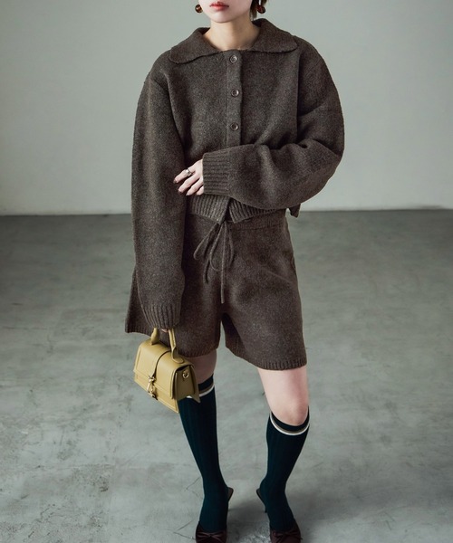 柔らかくて暖か、メランジニットが雰囲気抜群。衿付きデザインが韓国っぽくて可愛いショート丈のニットカーディガン。同素材のft0230008744(メランジニット ショートパンツ)とのセットアップでの着用が可愛い。シンプルだから単品使いもしやすく、短め丈でパンツにもスカートにも相性バッチリ。程よくゆとりがあるので中に着込めるのも嬉しい。お出かけコーデからカジュアル使いまで、幅広いスタイルに使えるアイテム。【備考】・裏地なし・替えボタン×1
