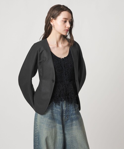 袖のラウンドとウエストシェイプのシルエットがクチュール感漂うノーカラージャケット。 ■デザイン ドルマンスリーブで丸みのあるラインにくびれのあるウエストをつくったジャケット。 シェイプのきいた美しいシルエットが特徴の1枚です。 ■素材 程よいハリと上品なツヤ感をもつ高密度コットンの二重織素材。 ■コーディネート ワイドデニムなどのボリュームボトムと合わせるとジャケットのデザインが引き立ちます。 ============================ 裏地:あり 透け感:なし 伸縮:なし 光沢感:あり ケア方法:ドライクリーニング ============================ 【注意事項】 ※商品に「取り扱い上の注意書き」、「洗濯表示」がございます場合は、使用前に必ずご確認ください。 ※商品画像は、光の当たり具合やパソコンなどの閲覧環境により、実際の色味と異なって見える場合がございます。あらかじめご了承ください。 ※商品の色味の目安は、商品単体の画像をご参照ください。 ※画像の商品はサンプルです。実際の商品と色味、仕様、加工、サイズ、素材等が若干異なる場合がございます。 店舗へお問い合わせの際は、全国のASTRAET各店舗まで下記の品名/品番をお申し付けください。 品名:AS CO CL/LESS SHAPE JK 品番:54222990002