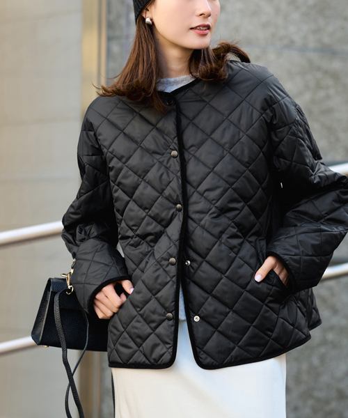 防風性のあるタフタ素材に、ベーシックなひし形キルト加工を施したショートブルゾン。裏表どちらでも着用できる2WAY仕様で、気分に合わせてスタイリングを楽しめます。表側は同色のドット釦でシンプルに、裏側は金属釦でアクセントを効かせたデザイン。パイピングにはコーデュロイを使用し、さりげないポイントをプラスしました。**********************透け感:なし裏地:なし伸縮性:なし光沢感:あり生地の厚さ:普通**********************※取り扱いについては、商品についている品質表示でご確認ください。※こちらの商品は、FRAMeWORK での取り扱いになります。直接店舗へお問い合わせの際は FRAMeWORK 店舗へお願い致します。※照明の関係により、実際よりも色味が違って見える場合があります。またパソコン・スマートフォンなどの環境により、若干製品と画像のカラーが異なる場合もございます。予めご了承の上ご注文ください。※商品の色味は、商品アップ画像をご参照ください。本体:洗濯機洗い(弱)