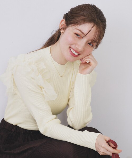 ショルダーチュールが主役級に映えるフリルハイネックニット【デザイン】・華やかなチュールフリルがショルダー部分に施され、シンプルでありながら存在感のあるデザイン。・ハイネックスタイルが顔周りをすっきり見せ、洗練された印象を与えます。・リブ編み素材が体にフィットし、女性らしいシルエットを際立たせます。・サイドスリットが施され、動きやすさとスタイリッシュな要素を両立。・同色でまとめられた異素材ドッキングデザインが、トレンドで華やかなコーディネートを演出します。【素材】・肌触りの良いニット素材に抗ピル加工が施されており、長時間の着用でも安心。・洗濯機OKなので、ご自宅で簡単なお手入れが可能。・適度なストレッチ感で、快適な着心地を実現します。※照明の関係により、実際よりも色味が違って見える場合があります。また、パソコン・スマートフォンなどの環境により、若干製品と画像のカラーが異なる場合もございます。モデル情報:身長163cm B81 W56 H82 着用サイズ:38(M)店舗へのお問い合わせ商品番号:C58-15006●製品寸法:36(S):着丈52cm B62cm 袖丈57cm 肩幅26cm38(M):着丈53cm B65cm 袖丈57cm 肩幅27cm40(L):着丈53cm B68cm 袖丈58cm 肩幅29cm42(LL):着丈54cm B72cm 袖丈58cm 肩幅31cm備考:
