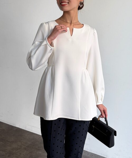 セレモニーにもおすすめ!オシャレに体型カバーも叶うブラウス■pointふんわり広がるペプラムシルエットで体型カバーも叶うブラウス。やや厚みのある生地感で高級感を演出。またシワになりにくいのも嬉しいポイント。キーネックでデコルテのシルエットもきれいに見せてくれます。高めの切り替え位置のペプラムデザインは脚長効果抜群!またふんわり広がるシルエットはコーディネートにメリハリを付けてくれます。■coordinate同生地のテーパードパンツと合わせたらセレモニースタイルもばっちり!ナロースカートやデニムなど普段のカジュアルアイテムに合わせてきれいめカジュアルコーデもおすすめです。▼オススメスタイリングアイテム▼【セレモニー対応可】フロッキードットテーパードパンツチュールフラットシューズゴールドバックルフラットパンプス■fabricポリエステル96%ポリウレタン4%--------------------------------------------------裏地:なし光沢感:なし伸縮性:なし生地の厚さ:普通洗濯方法:手洗い可--------------------------------------------------※生産の都合上、お届け時期が前後する場合がございます。ご注文いただいた予約商品のお届け時期の確認は、注文履歴ページより行えます。※商品画像は製品前により着用イメージです。光や角度により、実物と色味が異なる場合がございます。また表示のサイズ感も実物とは若干異なる場合もございますので、ご了承ください。※着用、お取り扱いの際は、商品についている品質表示とアテンションタグを必ずご確認ください。--------------------------------------------------♡をクリックでお得な情報をお知らせいたします。<商品お気に入り登録>お気に入りアイテムのお値下げ・再入荷・在庫ラスト1点など通知を受けることができます。<ブランドお気に入り登録>Chez toiの新商品・再入荷・SALE・クーポン配布などお得な情報を受けることができます。--------------------------------------------------Cheztoi/シェトワフランス語で「あなたの家」という意味。自分にまっすぐでそしてしなやかに生きる女性に向けたブランドです。