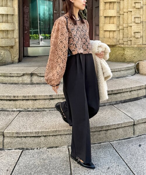 昨年人気だったサロペットとブラウスのセットがアップデートされて登場!繊細な花柄のレースが、普段のコーデをワンランクアップさせてくれます!ちょっとしたお呼ばれやパーティーシーンにぴったりなアイテム◎前後2wayのブラウスで、着脱のしやすいデザインになっています。セットで着るのはもちろん、単品でも着回しが効くのでコーディネートの幅が広がります。【POINT】・前後2wayで前ボタン仕様なので着脱しやすい・昨年よりもヒップを小さめにアップデート【STYLING】・カジュアルなデニムにブラウスを合わせれば、大人可愛いミックススタイルに・Tシャツにサロペットを合わせてキレイめカジュアルに【KEYWORD】オケージョン※生産の都合上、お届け時期が前後する場合がございます。ご注文いただいた予約商品のお届け時期の確認は、注文履歴ページより行えます。※お色物は色移りする可能性がございます。着用、お取り扱いは商品についておりますアテンションタグを必ずご確認ください。※商品画像はサンプル品を使用しているため、実際の商品と仕様、加工、サイズが若干異なる場合がございます。また、可能な限り実物に近いカラーにて掲載していますが、使用しているパソコンのモニター設定や、携帯電話のメーカー・機種により実際のカラーと異なって見える場合がございます。予めご了承ください。***********************商品の特徴【サロペット】透け感:なし裏地:なし伸縮性:なし光沢感:なし生地の厚さ:普通洗濯・取り扱い洗濯:液温は30℃を限度とし、手洗いができるクリーニング:ウエットクリーニング禁止タンブル乾燥:タンブル乾燥禁止アイロン:底面温度120 ℃を限度としてアイロン仕上げができる【ブラウス】透け感:あり裏地:なし伸縮性:なし光沢感:なし生地の厚さ:薄め洗濯・取り扱い洗濯:液温は30℃を限度とし、手洗いができるクリーニング:ウエットクリーニング禁止タンブル乾燥:タンブル乾燥禁止アイロン:アイロン仕上げ禁止***********************