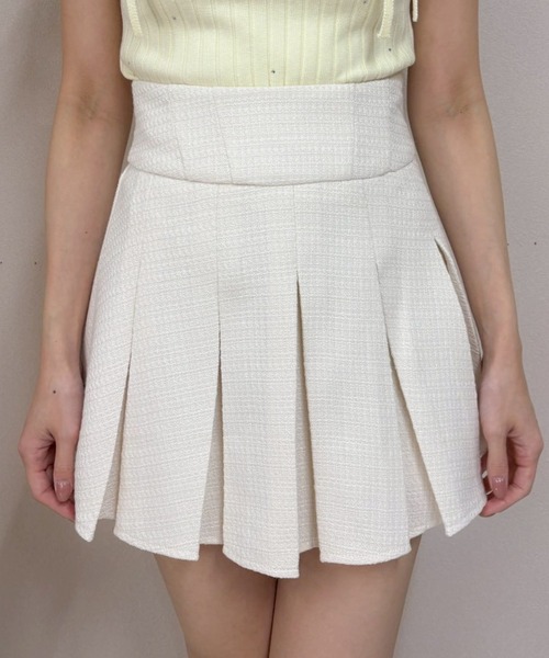 【point/coordinate】・ベーシックで使いやすい形のプリーツスカート。広がりすぎない絶妙なフレアで合わせやすいシルエット。・ウエストはワイドな切り替えで、着るだけで自然にウエストマーク!・後ろはZIPデザインで、バックスタイルまでしっかり盛れるポイントに。・後ろウエスト部分はゴム仕様なので、体にフィットしやすく着心地もラク。●カラー・ホワイトは春カラートップスに合わせやすい無地カラー。・ピンクは春らしい華やぎのある印象のカラー。・グレーは落ち着いたシックな雰囲気。・ミックス1はアイボリーベースのチェックで着映えする存在感。●スタイリング・同素材のジャケットと合わせてセットアップで着るのがおすすめ!・ミドルブーツやローファーと合わせると春らしいスタイルが完成。▼おすすめコーデアイテム000462200010 / ベルト付きツイードミドルジャケット000455850340 / ボリュームソールミドルブーツ000455850370 / ボリュームソールローファー【fabric】・何百種類の生地の中から厳選した、こだわりのスプリングツイードを使用。毛足が短く毛玉になりにくいタイプのツイードなので長く愛用しやすい素材感。