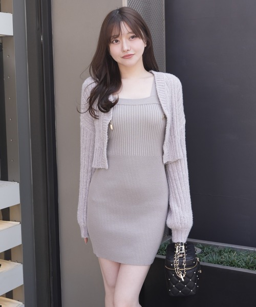 【point/coordinate】 ・カーディガンとワンピースのセットアイテム。 ・ワンピースはすっきりとしたタイトシルエットで身体のラインを美しく見せ、女性らしい雰囲気を演出。 ・カーディガンは程よいボリューム感とゆとりのあるシルエットで体型カバーもしつつ、 縦リブの編地で羽織るだけですっきりした印象に。 ・Sサイズはカーディガンがクロップド丈になっていて、自然とスタイルアップ。 ・Mサイズはカーディガンがヒップまですっぽり隠れる丈感で体型カバーも◎ ・フロントにはメタルの留め具を使用し、シンプルなデザインの中でもアクセントをプラス。 ●カラー ・アイボリーは温かみのある柔らかなトーンで優しい印象に。 ・ピンクは淡い春カラーで女性らしい雰囲気に。 ・グレーはくすみカラーで肌が白く見える絶妙な色。 ●スタイリング ・ブーツ合わせでこなれ感のあるスタイルを演出。 ▼おすすめコーデアイテム 000455850340 / ボリュームソールミドルブーツ 【fabric】 ・カーディガンはフェザーとモール糸をミックスしているので、 ふわっとした肌触りで着心地も良く、羽織るだけで温かい! ・ワンピースはコットンとアクリルの糸を使用しているので、柔らかく温かい着心地。