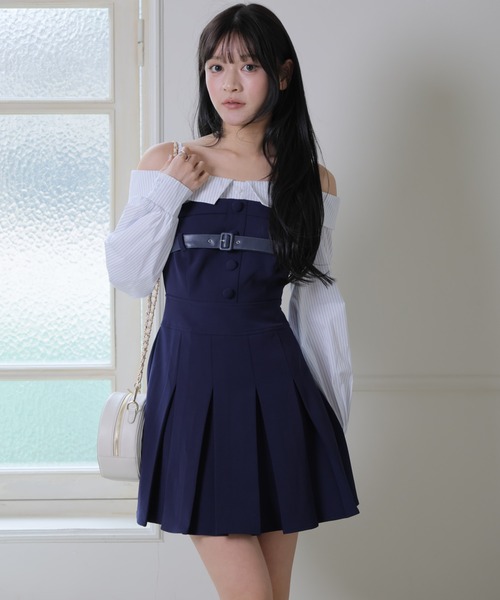 【point/coordinate】 ・シャツにベアワンピを重ねたようなレイヤード風コーデが1枚で完成! ・オフショルデザインでデコルテと肩のラインが綺麗に見え女性らしい雰囲気。 ・袖はボリュームスリーブで立体的なフォルム。 ・バスト部分はパネルラインでしっかり立体感をつけ綺麗なシルエット。 ・バストベルトをアクセントにしたメリハリデザイン! ・後ろはゴム仕様でストレスフリーな着心地。 ・スカート部分はプリーツデザインでガーリーな印象。 ・骨盤まわりはタックを閉じて広がりすぎない絶妙なバランス。 ●カラー ・ネイビーとブラックはシャツ部分がストライプでマニッシュな雰囲気。 ・ベージュは柔らかいトーンでワントーン配色。 ●スタイリング ・ローファーとソックス合わせでカレッジ風コーデ! ・ブーツ合わせで女性らしい印象。 ・カチューシャやアイウェアで小物盛るのもおすすめ。 ▼おすすめコーデアイテム 000455850370 / ボリュームソールローファー 000455850340 / ボリュームソールミドルブーツ 【fabric】 ・シャツ部分はハリのある素材感。 ・ワンピース部分は伸縮性のある生地でストレスフリーな着心地!