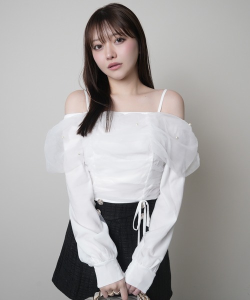 【point/coordinate】・オフショルデザインで肩からデコルテがすっきり綺麗に見えるトップス。・ふわっと広がるチュールにパールを散りばめた華やかなデザイン。・身頃はギャザーデザインで立体感が出て女性らしい雰囲気。・裾には華奢なリボンをあしらってガーリーなポイントに。・後ろはゴムシャーリングでタイトでも着やすい仕様。●カラー・ホワイトはどんなボトムにも合わせやすい万能カラー。・イエローとピンクは春らしい華やかさが出る柔らかいトーン。●スタイリング・デニム合わせでカジュアルダウンして抜け感。・ショートパンツなどのミニボトムでガーリー×ヘルシーなバランス。▼おすすめコーデアイテム000462300080 / キルティングポケットフレアデニムパンツ000462300090 / アシメベルトショートパンツ【fabric】・網目の細かいチュール素材を使用。柔らかく軽い肌当たりでストレスフリーな着心地。