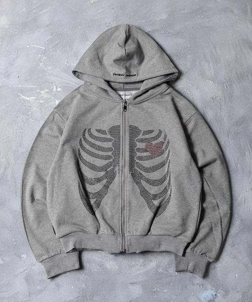 【MEMORY】ヘビーウェイト ボーン柄 ラインストーン ダブルZIPパーカー / Bone Pattern Rhinestone Double-Zip Hoodie
