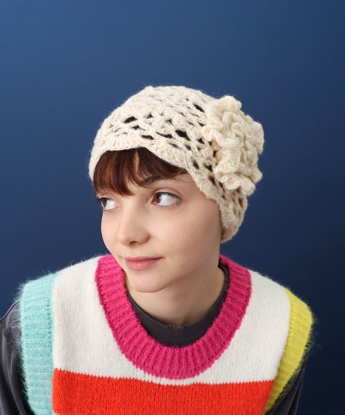 立体的なフラワーモチーフがアクセントのニットキャップ 軽い着用感ながらほどよい暖かさをキープ。 通気性のある透かし編みが、冬コーデに抜け感をプラスします。 斜めにかぶるとシルエットがきれいに決まり、顔周りを優しく華やかに見せるのが魅力。 カジュアルにもフェミニンにも合わせやすいアイテムです。
