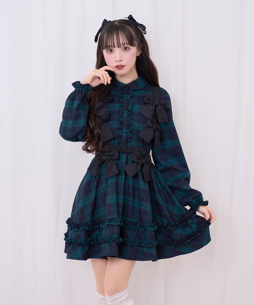 リボンをたくさんつけたハーネスが目をひくワンピース♪落ち着いたカラーのワンピースにフリルをたっぷりつけてハニーシナモンらしくまとめたアイテムです♡肩紐は2種類の長さで調節可能です。