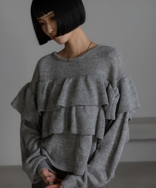 ■素材■ふんわりした柔らかさと軽さのあるアクリル糸を使用しています。■デザイン■胸元に施されたフリルデザインが目を引くニットプルオーバーです。一枚で着るだけで、コーディネートの主役になります。■スタイリング■着ぶくれしない軽やかなニットなので、ボリュームあるボトムでもすっきり着こなせます。スカートでもパンツでも合わせやすいトップスデザインです。■洗濯■手洗い.