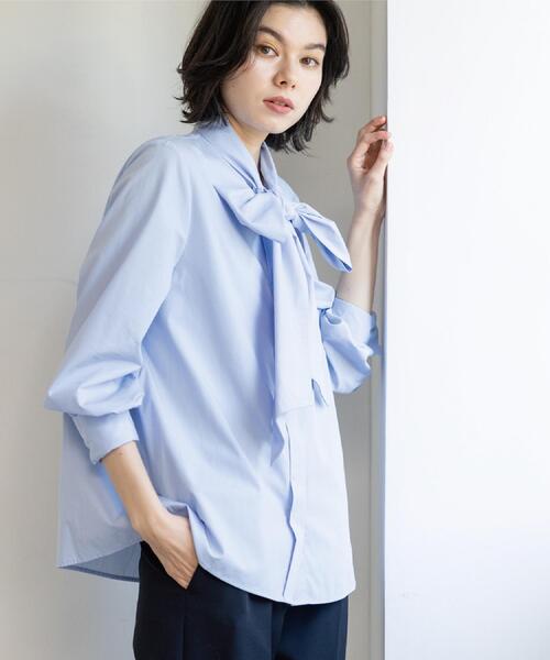 程よいハリのあるシャツ素材を使用した、上品なボウタイブラウス【デザイン】・シンプルながら華やかな印象を与えてくれるボウタイデザインブラウス。・前開きでボタンを比翼仕様にすることにより、シンプルで上品な一枚に仕上げました。・程よいハリのあるシャツ地を使用しており、ボウタイ部分に華やかな立体感が生まれます。・一枚ではもちろん、ジャケットやジレのインナーとしても相性◎です。・お仕事やお出かけにはもちろん、ジャケットを羽織れば、入学式・卒業式などのセレモニースタイルにもぴったりです。【素材】・程よいハリがありつつも、インナーにしたときもごわつかない厚みのシャツ地を使用。・コットン/ポリエステルの素材で、コットン見えしつつも取り扱いがしやすい一枚。・マシンウォッシャブルでお手入れも簡単です。※照明の関係により、実際よりも色味が違って見える場合があります。また、パソコン・スマートフォンなどの環境により、若干製品と画像のカラーが異なる場合もございます。モデル情報:身長162cm B83 W60 H84 着用サイズ:38(M)店舗へのお問い合わせ商品番号:637-85042●製品寸法:36(S):着丈64cm B101cm 袖丈61cm 肩幅38cm38(M):着丈65cm B104cm 袖丈62cm 肩幅39cm40(L):着丈67cm B107cm 袖丈63cm 肩幅40cm42(LL):着丈67cm B110cm 袖丈64cm 肩幅41cm備考: