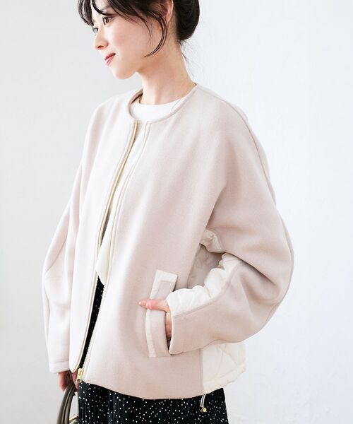 ふんわりとしたウール混の生地に、軽やかなダウンキルティングを合わせた異素材アウター。●ポイント背中と袖にかけてのさりげない切替えが丸みのあるシルエットを引き立てつつ、すっきりと見せてくれます。ダウン80%・フェザー20%で軽く、着心地もあたたか。ファスナーのゴールドが上品なアクセントになって大人のデイリーアウターにちょうどいい一枚です。カラーはライトベージュとブラックの2色展開で、ニュアンスカラーのライトベージュは淡色コーデやワントーンに馴染みよく、ブラックはすっきりモードに引き締めてくれます。※取り扱いについては、商品についている洗濯表示にてご確認下さい。※照明の関係により、実際よりも色味が違って見える場合がありますまたパソコン・スマートフォンなどの環境により、若干製品と画像のカラーが異なる場合もございます。※商品の色味は、商品アップ画像をご参照ください。【注意事項】・画像の商品はサンプルです。・サイズ表記はあくまで目安となります。実際の商品と仕様、加工が若干異なる場合があります。