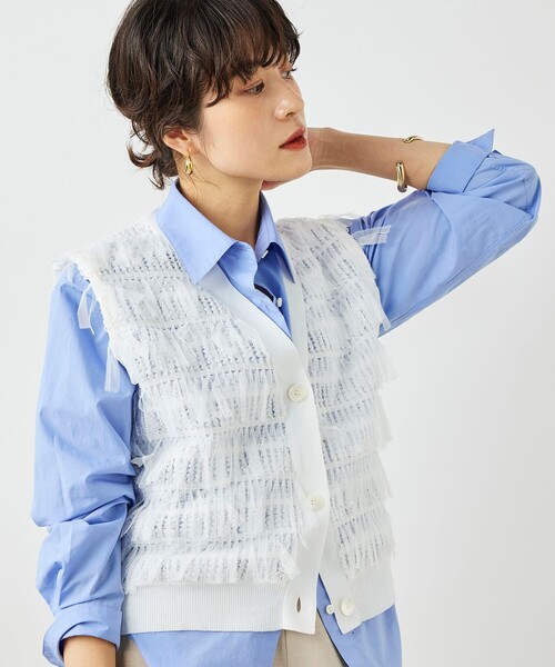 ◇26SS◇NOLLEY'S◆Point・着映えする華やかさのあるベスト・前身頃がチュールフリンジ生地・ニット部分はポリエステルリネンの天竺編み・張りがあり、さらっとした感触はロングシーズン着用可能・デニムやパンツなどとシンプル合わせが◎・インナーにシャツを着てすっきりレイヤードも楽しい一枚・同素材Vネックカーディガン(6-0035-2-02-012)あり・手洗い可●お取扱い上のご注意●末永くご愛用頂くために、アテンションタグを必ずご確認の上、着用又はお取り扱い下さい。気になる商品は、お気に入り登録がオススメです!クーポン情報、入荷情報が、通知されるようになります。※店頭及び屋外での撮影画像は、光の当たり具合で色味が違って見える場合があります。商品の色味は、スタジオ撮影の画像をご参照下さい。※商品画像に関しては出来る限り忠実に表示出来るよう努めておりますが、お客様がご利用のモニターの設定及び特性により、実際の商品と比較し色味に若干の誤差が生じる場合があります。※画像の商品はサンプルとなりますので実際の商品と仕様、加工、サイズが若干異なる場合がございます。