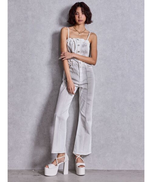 商品コメント: 今シーズンは、アイスのケミカル感ある加工/インディゴはオーバーダイを入れ、 ヴィンテージ感ある加工/ホワイトは、ブラック加工を上に施したトレンド感ある表情に仕上げた3色展開です。 フロントボタンで着脱もしやすく、後ろのバックリボンデザインでセクシーなGYDAらしいディテールに。 ストレッチの効いたデニム素材を使用し、上身は締め付け感のないジャストサイズくらいで肩紐や、 バックリボンでサイズ調節可能な仕様です。 ボトム部分はフレアシルエットで美脚効果もあり、トータルのスタイルアップが完璧な1着です。 コーデ: 1枚着用でニットカーディガンを羽織るスタイリングや、インナーにタイトTシャツをレイヤードしても◎