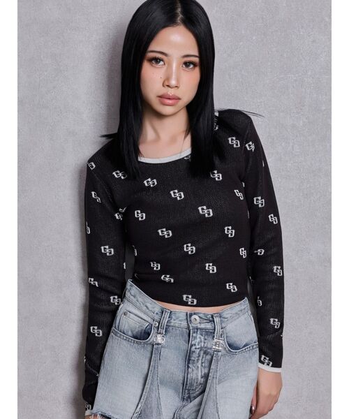 商品コメント: GGの総柄をジャカードで編立て、襟と袖口を配色にしているデザインがポイント。 さらっとしたニット素材で、タイトショートのサイズ感ですが、インナー合わせで着るように着丈は調整しています。 1枚でも存在感抜群の1着◎ コーデ: BACKリボンロンパース・スカートのインナー合わせや、デニムアイテムとの相性抜群です。