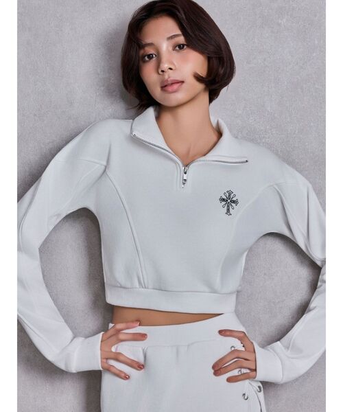 商品コメント: 表も裏もキメ細かく、なめらかな肌ざわりの良いスウェット生地を使用。 ハーフジップとクロップド丈を採用し、すっきりさせ、左胸にクロスの刺繍を施した1着。 sacred edge cross(セイグリッドエッジクロス)は聖なる鋭さ、強さを表しギャルっぽく強めのクロスモチーフ。 コーデ: お揃いデザイン展開しているスウェットスカートSETUP着用がマストです。 ハイウエストデニムとの相性も抜群です。