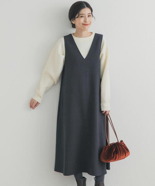 スタイルアップを叶えるタック入りAラインVネックジャンスカメランジのヘリンボーン柄が上品な表情を生み出すVネックジャンスカ。3種類の糸を撚り合わせて染め分けることで、奥行きのあるミックス感を表現したこだわりの素材を使用しています。あえて高速機械を使わず、ゆっくりと織り上げることで生地にふくらみを持たせ、さらに軟水で仕上げることでソフトで心地よい風合いに。フロントはシンプルに仕上げ、バックにはタックを入れることで縦のラインを強調し、細見え効果を実現しました。Aラインのシルエットは体のラインを拾わず、誰でもきれいに着こなせる万能デザイン。ゆとりのあるサイズ感なので、ボリュームのあるニットもインナーに着用でき、秋冬のレイヤードスタイルにぴったりの一枚です。上質な素材感と美しいシルエットを兼ね備えた、大人のためのジャンスカです。【2025 Autumn/Winter】【25AW】総重量 : 約605g※商品画像は、光の当たり具合やパソコンなどの閲覧環境により、実際の色味と異なって見える場合がございます。予めご了承ください。※商品の色味の目安は、商品単体の画像をご参照ください。▼お気に入り登録のおすすめ▼お気に入り登録された商品は、マイページにて現在の価格情報や在庫状況の確認が可能です。お買い物リストの管理にぜひご利用ください。素材感透け感 : なし伸縮性 : ややあり裏地 : あり光沢 : なしポケット : ありFREE