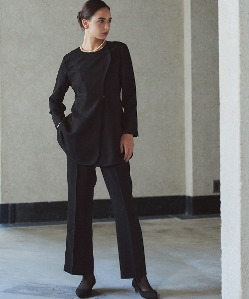 【喪服・礼服】日本製生地使用 洗える防しわ 楊柳柄エンボス加工アシメデザインジャケットパンツスーツ<大きいサイズ有>〔Callarus〕