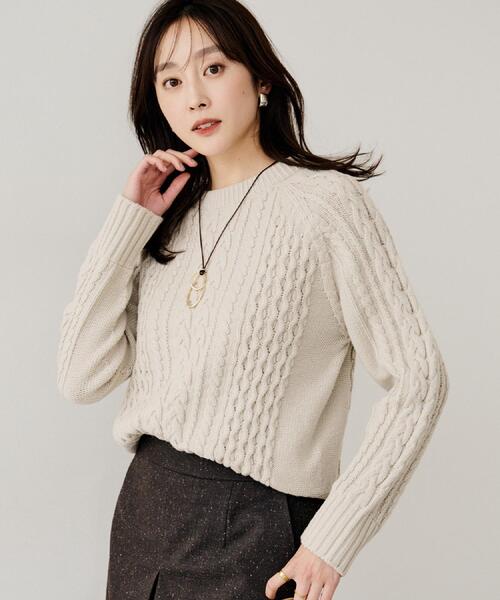 【デザイン】 暖かくふくらみのあるスポンディッシュで軽い素材、一枚で着てもコートインでも着やすい肉感のケーブル柄プルオーバーニット。 肩のラインに丸みが出て、すっきりと決まるラグランスリーブにややコンパクト目なシルエットはボトムインもアウトスタイルにも。 デイリーからオフィスまで幅広いシーンで活躍してくれます。 【素材感】 21.5マイクロンのウールとバルキーアクリルをミックスして作られた、軽くスポンディッシュな膨らみのある32番手の梳毛糸4本を撚糸した、暖かみのあるミドルゲージのボリューム感が特徴の毛混コード糸。 【着こなしポイント】 軽くゆれるスカートに合わせてフェミニンスタイルや、ワイドパンツに合わせてマニッシュにも。 ニットのやわらかいカラーを活かしたカラースタイリングもおすすめです。 ※照明の関係により、実際よりも色味が違って見える場合があります。また、パソコン・スマートフォンなどの環境により、若干製品と画像のカラーが異なる場合もございます。 店舗へのお問い合わせ商品番号:153-14698 ●製品寸法: 00(XS):着丈52cm B90cm 裄丈72cm 02(M):着丈55cm B98cm 裄丈76cm 04(2LT):着丈59cm B104cm 裄丈79cm 44(3L):着丈58cm B112cm 裄丈78cm 48(5L):着丈58cm B120cm 裄丈80cm 備考: