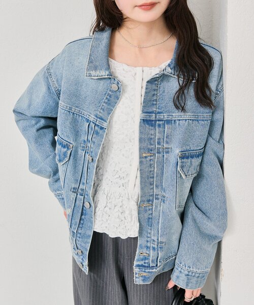 オーバーサイズシルエットが魅力のデニムジャケットが登場!●デザイン・デイリー使いしやすい、ゆったりとした絶妙なルーズシルエットのデニムジャケット。・トレンド感のあるオーバーサイズで着心地が良く、ラフに着こなせます。・フロント部分はタックが入ったデザイン。大きめのフラップポケットがアクセントになり、機能性も◎・どんなアイテムにも合わせやすく、程よい厚みでロングシーズンお使いいただけます。●スタイリング・Tシャツとデニムパンツのカジュアルなスタイルに羽織るだけで、こなれ感を演出できます◎・スラックスやミニ丈のボトム合わせで、すっきりした印象に見せてくれます。・ワンピースやスカートと合わせて、甘辛ミックススタイルを楽しむのがおすすめです。●おすすめスタイリングアイテム・シャーリングペプラム TOPS・【新色NAVYが登場/ストライプ柄、無地 / ウエストの配色がポイント】Wベルトパンツ・レース花柄シアーロンT●スタッフ着用コメント身長152㎝ 骨格ウェーブ長すぎない丈感でバランスが取りやすく、様々なコーディネートに取り入れやすいです。パンツでもスカートでも、カジュアルにもきれいめにも合わせやすいので、重宝しそうです◎!身長163㎝ 骨格ナチュラルゆったりと着られて、リラックス感があります。ワンピースに羽織ると可愛いです!普段使いはもちろん、ちょっとしたお出かけや旅行にも最適です!<製品の取り扱い注意>・雨や汗による、濡れた状態での使用は、色落ちや色移行の原因となる場合がありますので十分にご注意下さい。・摩擦により淡い色のものとの重ね着や、イス、バッグ、ベルトなどへ色移りしますのでご注意ください。 本製品は洗濯の繰り返しや着用による摩擦などで色が薄くなっていきます。ご了承ください。・濃色は摩擦(特に湿った状態での摩擦)や、汗や雨などでぬれた時は他の衣料や下着に色が移る事がありますので、ご注意下さい。-----------------------------------------------------裏地:なし伸縮性:なし光沢感:なし生地の厚さ:普通------------------------------------------------------商品のお気に入り登録➡ お気に入りアイテムの値下げ・再入荷・在庫1点などの通知を受け取ることができます。ブランドのお気に入り登録➡ 新商品や再入荷、セール、クーポン配布などお得な情報を受け取ることができます。※サイト上のカラー名と、お届け商品に記載されているカラー名が異なる場合がございます。※商品の色味は、撮影場所や光のあたり具合などにより色味が違って見える場合が御座います 。 また、お客様のお使いのPCのモニター環境などにより色味が違って見える場合が御座います。予めご了承の上ご注文下さい。※ご注文いただいた予約商品のお届け時期の確認は、注文履歴ページより行えます。------------------------------------------------------