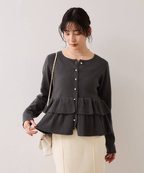 【2025 Autumn/Winter】【25AW】<POINT>・トレンドのペプラムディテールをフェミニンなティアードできちんと感もありながら、アップデート!【デザイン・シルエット】フロントのパール釦が清楚な女性のイメージで、裾のペプラムティアードが更にフェミニンンな女性がイメージできる1着です!カーディガンですが、プルオーバー感覚で、一枚着としても活躍できます。【素材】手洗い可能。アクリルコットンポリエステルのモチモチとした肌ざわりの良いニット素材を使用しています。【カラー】トレンドのチャコールグレー、ニュアンスのあるライトグレー、ベーシックなライトベージュ、清楚感のあるネイビーの4色展開です。【おすすめのスタイリング】ボトムはすっきり感のあるワイドパンツやストレートパンツ、Iラインスカートが女らしいスタイリングとしておすすめ!-----------------------------裏地:なし光沢感:なし透け感:べージュ(27)のみややあり伸縮性:ありボタン:あり(開閉可)生地の厚さ:普通季節:春、夏、秋、冬-----------------------------【モデル着用サイズ】身長:161cm 着用サイズ:F※画像の商品はサンプルです。 実際の商品と仕様、加工、サイズが若干異なる場合がございます。※画像によっては実際の色味と異なる場合があります。正しい色味は生地アップ画像をご確認ください。