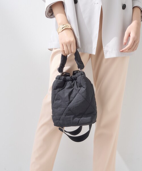 【デザインポイント】 ふかふかの綿を内蔵した見え感もかわいい巾着バッグです。 超軽量素材を使用し、手持ち感がとても軽いのもポイント。 縦長のフォルムと少しスポーティなディティール使いで、大人も持ちやすいカジュアルアクセントバッグに仕上げました。 【スタイリングポイント】 モードやキレイめカジュアルスタイルに加えるだけでトレンド感を演出してくれるアイテムです。 敢えてコートなどのアウターシーズンに持つのもカジュアルダウンスタイルとしてこなれ感がぐっと出ておすすめです。 【仕様】 ・ポケット数:外側×1 内側×2 ※照明の関係により、実際よりも色味が違って見える場合があります。また、パソコン・スマートフォンなどの環境により、若干製品と画像のカラーが異なる場合もございます。 店舗へのお問い合わせ商品番号:127-05152 ●製品寸法: 00(FREE):高さ21cm 幅(上部)~20cm 幅(下部)16.5cm マチ10cm 持ち手上がり13cm 付属ショルダー対応サイズ60~116cm 備考:重量:約210g(サンプルサイズ)