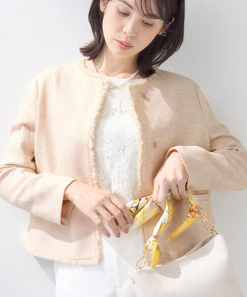 【デザインポイント】軽い素材感のツイードを使用した華やかなノーカラージャケットです。ハレの日でもより気軽にご着用いただきたいという想いから、シルエットを拾わず身体から程よく離れる2面体パターンのシルエットでお作りしています。取り外し可能なパール調バーがセットとなっており、着用シーンによってスタイリングをお楽しみいただけます。【スタイリングポイント】ハレの日や行事などでもご着用いただけるアイテムなので、パンツ・スカート問わずスタイリング可能です。付属のパール調バーは上下に留め具がついており、ジャケット前端箇所にあるパーツでつけ外しいただけます。【SETUPアイテム】ジャケット:127-45001ワンピース:127-55004【素材ポイント】スラブ糸を使用し、表情に拘った素材になります。軽くて着心地感を考えたストレッチツイード素材です。【仕様】・ポケット数:横×2・裏地:総裏仕立て※照明の関係により、実際よりも色味が違って見える場合があります。また、パソコン・スマートフォンなどの環境により、若干製品と画像のカラーが異なる場合もございます。モデル情報:身長170cm B74 W60 H86 着用サイズ:38(M)店舗へのお問い合わせ商品番号:127-45001●製品寸法:05(XXS):着丈45cm B90cm 袖丈52cm 肩幅36cm12(LL):着丈50cm B108cm 袖丈57cm 肩幅42cm13(LL):着丈50cm B112cm 袖丈57cm 肩幅43cm15(3L):着丈50cm B116cm 袖丈57cm 肩幅43cm19(5L):着丈52cm B124cm 袖丈56cm 肩幅45cm36(S):着丈47cm B97cm 袖丈56cm 肩幅38cm38(M):着丈48cm B100cm 袖丈57cm 肩幅39cm40(L):着丈49cm B103cm 袖丈58cm 肩幅40cm備考:重量:約300g(サンプルサイズ)