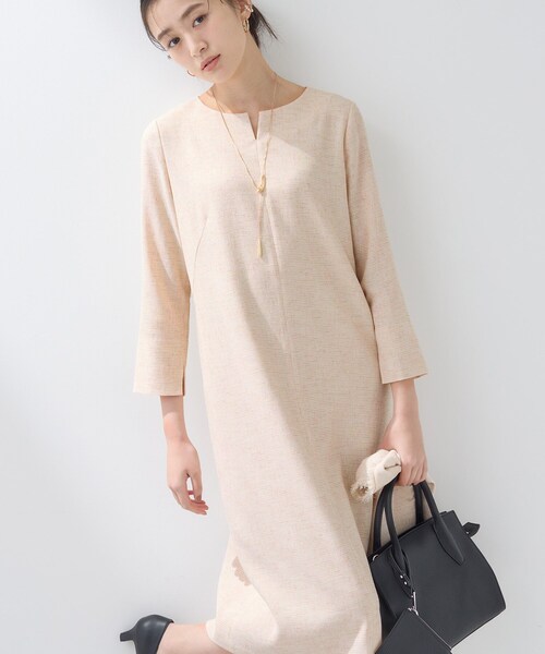 【デザインポイント】軽い素材感のツイードを使用したAラインワンピースです。ほどよいゆとりは保ちながらも、すっきりとしたシルエットでお作りしているので幅広いシーンでご着用いただけます。抜け感のあるフロントのスリットデザインと、スタイルアップ見えする縦切り替えがポイントです。【スタイリングポイント】セレモニーなどの場面では同素材で展開しているジャケット(127-45001)を合わせていただくことで、より華やかな印象となります。意匠感のあるツイード素材なので1枚でもご着用いただくことができ、パールネックレスとの合わせがおすすめです。【SETUPアイテム】ジャケット:127-45001ワンピース:127-55004【素材ポイント】スラブ糸を使用し、表情に拘った素材になります。軽くて着心地感を考えたストレッチツイード素材です。【仕様】・ポケットなし・後ろファスナー・袖以外裏地あり※裏地のない部分はやや透け感があります。※照明の関係により、実際よりも色味が違って見える場合があります。また、パソコン・スマートフォンなどの環境により、若干製品と画像のカラーが異なる場合もございます。モデル情報:身長170cm B74 W60 H86 着用サイズ:38(M)店舗へのお問い合わせ商品番号:127-55004●製品寸法:05(XXS):着丈94cm B90cm 袖丈47cm 肩幅36cm W89cm H96cm13(LL):着丈107cm B109cm 袖丈50cm 肩幅43cm W108cm H115cm15(3L):着丈107cm B113cm 袖丈50cm 肩幅43cm W112cm H119cm19(5L):着丈107cm B121cm 袖丈49cm 肩幅45cm W120cm H127cm36(S):着丈102cm B94cm 袖丈49cm 肩幅38cm W93cm H100cm38(M):着丈104cm B97cm 袖丈50cm 肩幅39cm W96cm H103cm40(L):着丈106cm B100cm 袖丈51cm 肩幅40cm W99cm H106cm備考: