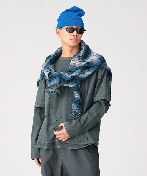 リアルなダメージ加工が存在感抜群 ■デザイン 半袖と長袖を重ねたレイヤードTシャツ。長年着込んだようなリアルなダメージ加工とフェード加工が特徴です。 ■サイズ 【ワイドショートフィット】 ワイドな身幅に対し、着丈を短く設定したシルエット。 適度な短さが魅力で、レイヤードスタイルなどトレンド感のあるスタイリングにお勧めです。 ※こちらの商品の「アイテムサイズ」には、半袖、長袖両方のサイズを記載しております。 ■素材 厚みの異なる2種類のコットン天竺素材を組み合わせることで、自然な立体感を表現。 生地の厚さ:普通 ストレッチ性:ややあり 光沢感:なし 透け感:なし 裏地:なし ※光の当たり具合やパソコンなどの閲覧環境によって、実際の色味と異なって見える場合がございます。予めご了承ください。 ※商品の色味は商品単体で撮影した画像をご参照ください。 【お気に入り機能を使ってお得な情報をGET!】 ●商品のお気に入り登録(ハートマークをクリック) ・残り1点、再入荷、お得なセールやクーポンなどの通知を受け取れます。 ・お気に入りした商品は一覧で閲覧でき、あとで見返すのに便利です。 ●ショップ・ブランドのお気に入り登録 ・新商品や再入荷、クーポン配布などいち早くブランドのお得な情報を受け取ることができます。