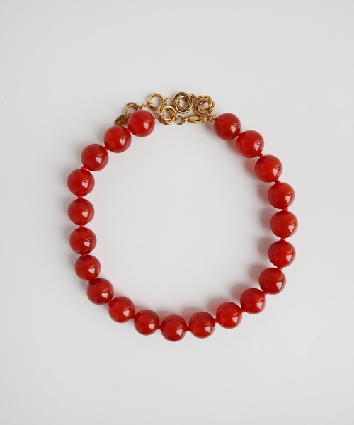 主役になる、赤。深みのある大粒のレッドアゲートを贅沢に使った、インパクト抜群のネックレス。ひと粒ひと粒がしっかり存在感を放ち、コーディネート全体を引き締めてくれる。ボリュームはあるのに、洗練された印象。大人のモード感を引き立てるアイテムです。無地のトップスに合わせるだけで、雰囲気が一変。服を選ばず、スタイルの“軸”として活躍してくれる一本。■レッドアゲート(赤瑪瑙)深みのある赤が印象的なレッドアゲート。同じ赤でも、オレンジがかったものからブラウン寄りまで、表情に幅があり、コーディネートに温もりと強さをプラスしてくれる天然石です。古くから「絆を深める石」「心を安定させる石」とされ、内側のバランスを整える力があるといわれています。感情に流されず、自分のペースで進みたいときのサポートに。ボリュームのあるスタイルでも、落ち着きのある色合いで取り入れやすいのも魅力。存在感と安心感、どちらも備えた石。025046※天然パーツの色味や大きさには若干の個体差があります。また、パールや天然石ビーズの柄は1つづつで方が異なり、内包物や色味の違いも風合いの一つとしてお楽しみいただければと思います。天然パーツのサイズは均一で無い場合があります。全体のバランスを考えて作成いたしますので、粒数などが多少前後することがあります。※繊細な作りですので、強い衝撃、引っ掛けなどにご注意ください。