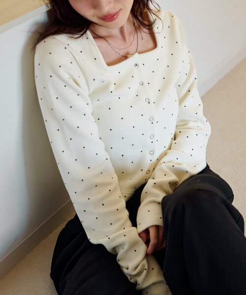 カジュアルにもフェミニンにもマッチするカーディガン※花柄2色はWEB限定カラーです※サイトによってカラー表記が異なります。ZOZOTOWN:ホワイト系その他 PALCLOSET:エクリュZOZOTOWN:ダークブルー PALCLOSET:ミッドナイトブルー■デザイン女性らしい可愛らしさとカジュアルな抜け感を兼ね備えたサーマルカーディガン。程よく体にフィットするシルエットで、すっきりとした印象を演出してくれます。スクエアネックがデコルテを美しく見せ、上品さをプラス。前面には小さなボタンが並び、全て閉じてコンパクトなトップスとしても、開けてカーディガンとしても着用可能な一枚です。■生地感しっかりとしたハリ感が特徴の生地感。伸縮性は控えめですが型崩れしにくいため、きれいなシルエットがキープされます。***********************洗濯方法:手洗い可能裏地:無し透け感:無し伸縮性:ややあり光沢感:無し生地の厚さ:普通***********************■コーディネートスラックスやデニムにフリルのスカートを合わせると、甘すぎない絶妙なバランスのコーディネートに仕上がります。足元はバレエシューズやスニーカーで抜け感を演出するのがおすすめです。【お取り扱いの注意】※着用時、洗濯時は必ず取り扱い表示・タグをご確認の上、お取り扱いください。※サイズ採寸は各モールによって異なり、多少の誤差が生じる可能性がありますのでご了承ください。※撮影画像はサンプル品を使用しているため、実際の商品とカラー、仕様、加工、サイズが若干異なる場合がございます。使用しているパソコンのモニター設定や、携帯電話のメーカー・機種により実際のカラーと異なって見える場合がございます。予めご了承ください。▼商品のお気に入り登録ハートマークをクリックし、お好きなカラーを選んでお気に入りに登録完売カラーの再入荷通知や、ラスト1点の通知、セールの通知も受け取ることができます。▼ブランドのお気に入り登録新商品や再入荷等、いち早くブランドのお得な情報を受け取ることができます。<返品・キャンセルについて>・着用・洗濯後の返品・ご交換は致しかねます。・商品到着後、着用前に商品を確認して頂きますようお願い致します。