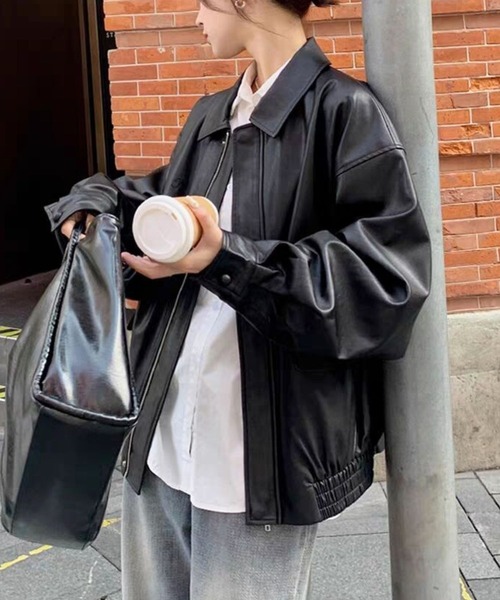 定番フェイクレザージャケット ボタンとジップのダブル使い◎ 程よくオーバーなサイズ感でゆったりと着用いただけます。 秋~春先までロングシーズン可能なので1枚持っていて間違いないマストアイテムです。